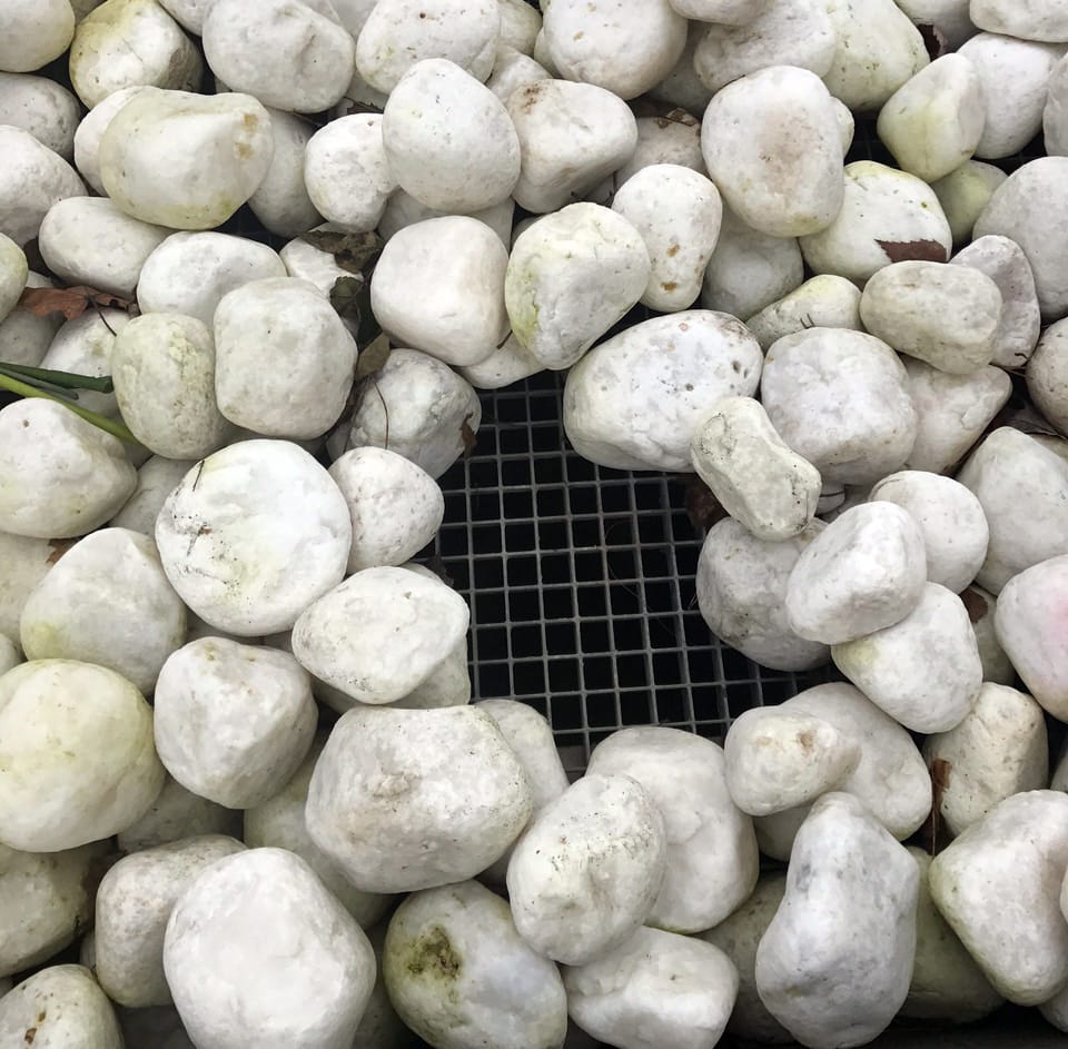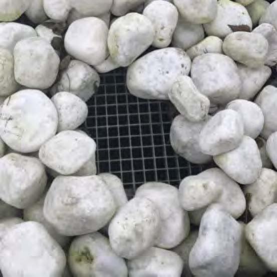 • Galets roulés en marbre blanc, pour une esthétique intemporelle et apaisante.